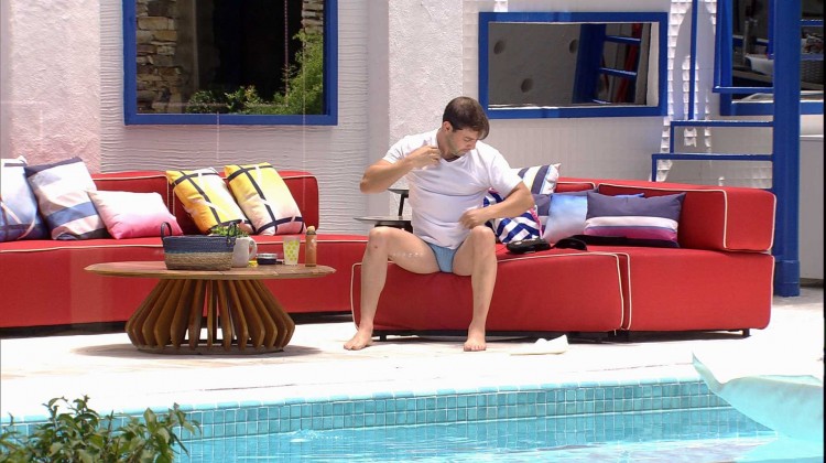 Enquanto os colegas de confinamento dormem, Caio prepara uma bebida sozinho na Xepa do BBB21. Em seguida, o brother vai para a área da piscina, passa protetor solar e conversa com Juliette.