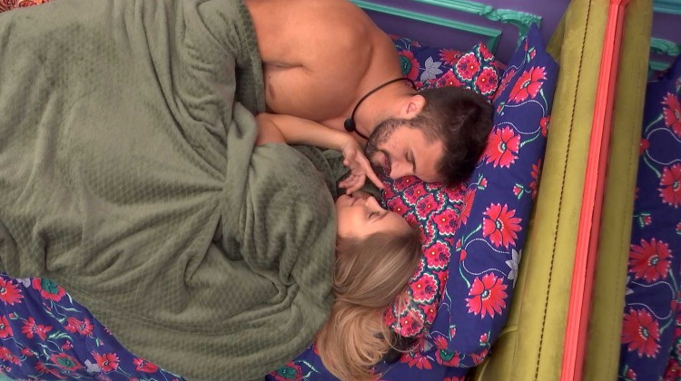 Carla tira a coberta e os dois se divertem com a situação a e voltam a trocar beijos.