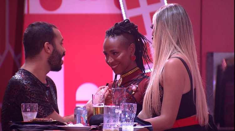 Logo em seguida, Karol Conká brinca: “Ele acha que eu sou o Lucas e já quer me beijar”. Então, ela e o brother dão um selinho. Gilberto puxa Sarah e os três dão mais um selinho.