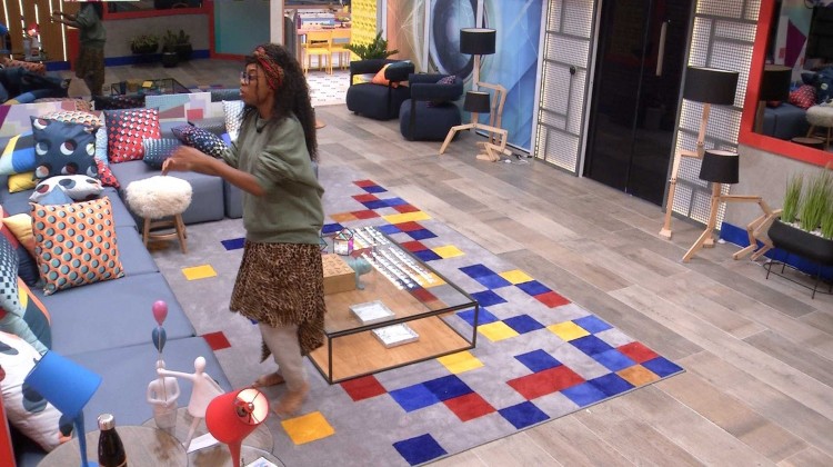 Sozinha na sala da casa do BBB21, Lumena faz uma coreografia da música "Talismã", da cantora Iza.