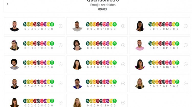 O Paredão é falso, mas os emojis são verdadeiros no BBB21. Após o Jogo da Discórdia que rolou na noite anterior, os confinados avaliaram seus colegas de confinamento no Queridômetro desta terça feira, 9/3. Carla Diaz foi a única que escolheu uma "banana" para presentear um brother: Fiuk. A sister também optou por "coração partido", pelo segundo dia consecutivo, para Arthur e para o Líder Rodolffo. Xi...