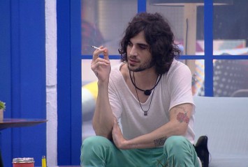 Nego Di está na área externa da casa e conversa com Projota, Rodolffo e Caio sobre uma atitude de...